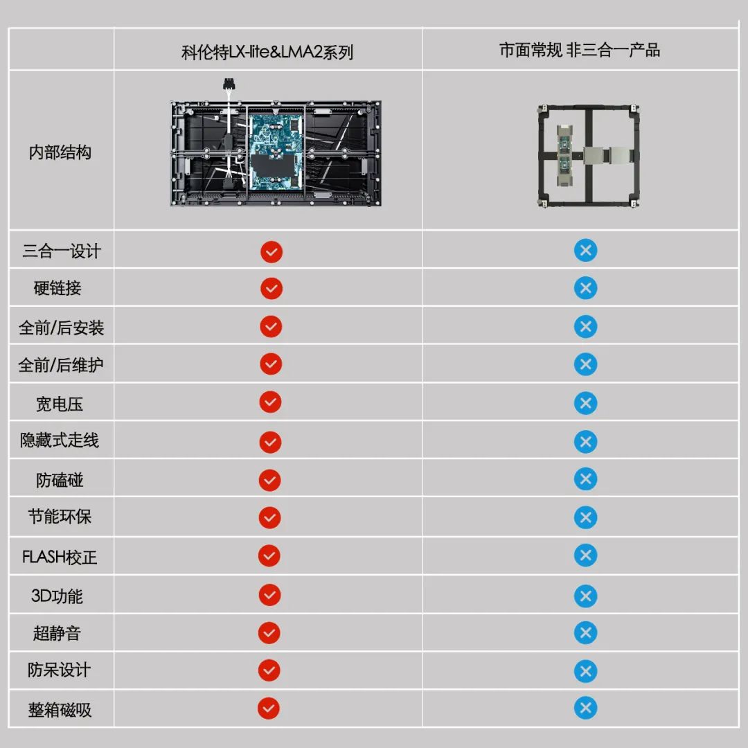 LX-lite&LMA2系列全彩小间距,均采用电源、转接板(HUB)、接收卡三合一,一体化设计,具备结构稳定、色彩鲜明、安装便捷、节能环保、使用方便等特点。区别传统的LED箱体,LX-lite&LMA2系列三合一设计的优势如下:1、高产品集成度。三合一设计将多个功能部件整合在一起,提高了产品的集成度,使得整体结构更加紧凑和美观。2、更轻更薄更美观。三合一设计将极大的优化LED内部箱体布局,降低箱体重量,使之更轻更薄更美观,以G22恒峰LX-lite为例,重量仅为3.4Kg,最薄处仅16mm。3、高可靠性和安全性。三合一设计减少了外部连接和接口数量,降低了因连接不良或接口松动导致的故障风险,提高了产品的稳定性和可靠性。4、简化施工难度。三合一设计将传统需要分别安装的电源、转接板和接收卡集成在一起,减少了施工步骤和安装时间。5、节省安装及维护费用。三合一设计减少了所需部件的数量,降低了材料成本,同时简化了安装和维护过程,减少了人工费用。