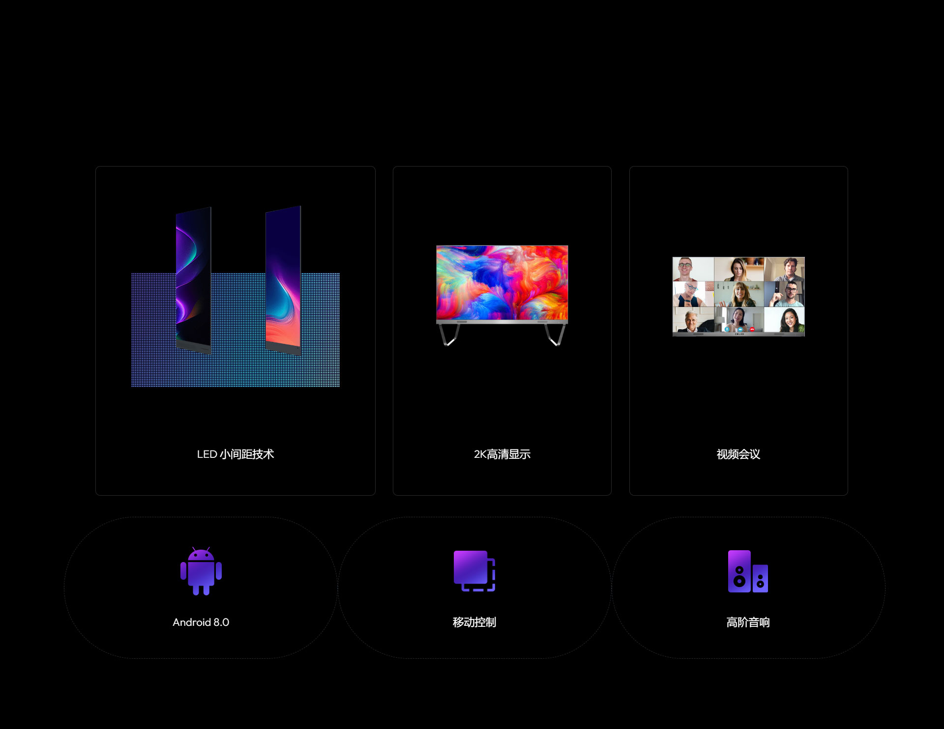 集全球领先LED 小间距技术、2K高清显示,安卓,视频会议,移动控制,高阶音响等为一体。