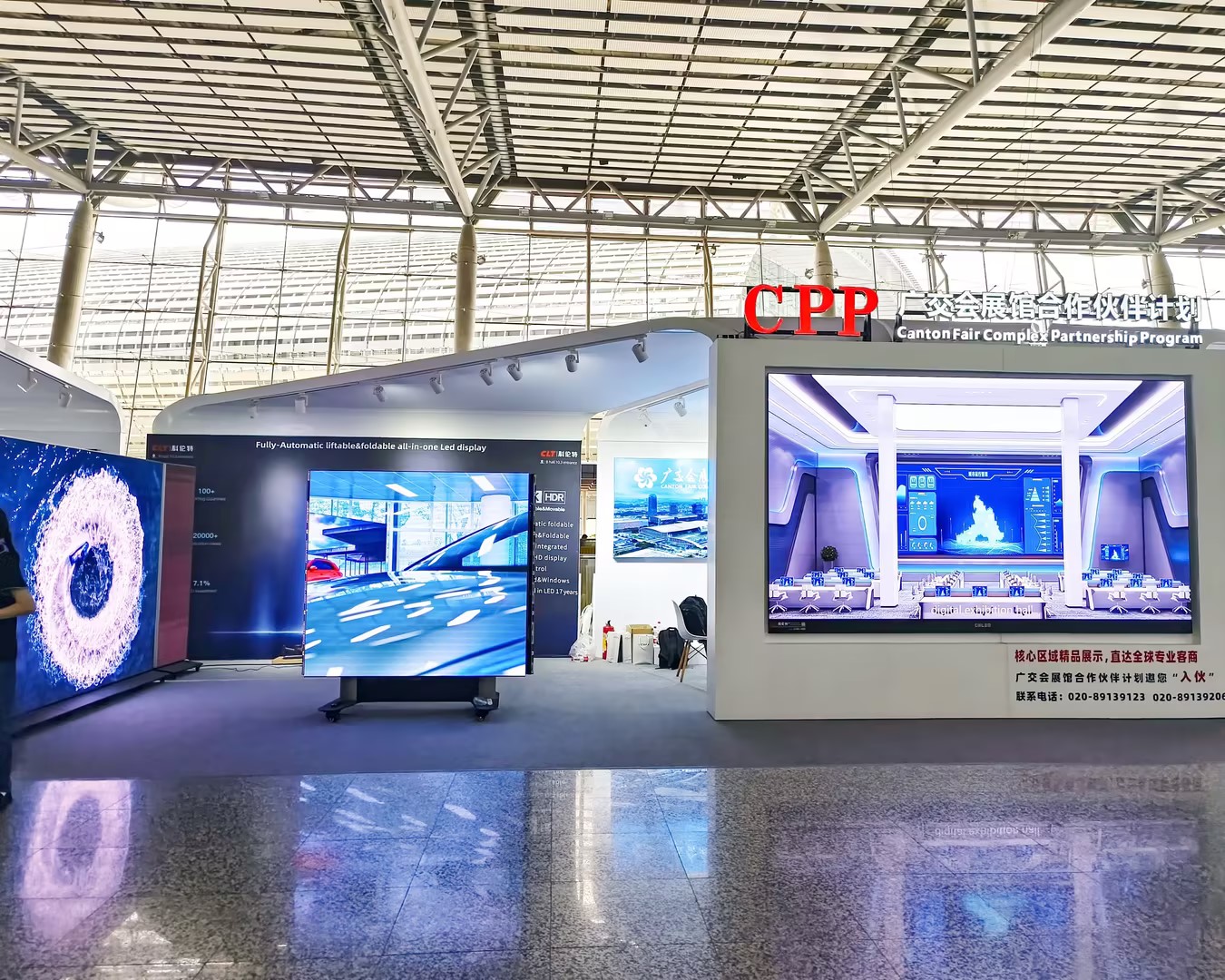 10.3馆入口飘台独立展位则展示了G22恒峰领先行业的全球首款LED全自动升降一体机等创新产品,彰显了G22恒峰作为“广交会连续11LED屏幕指定供应商”的深厚底蕴。