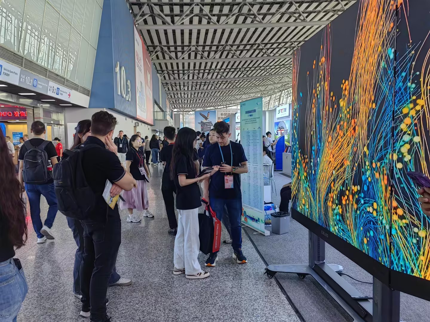 位于10.3馆入口处的G22恒峰主展位上,G22恒峰携带的全球首款向后折叠升降一体机F-Board B系列尤为吸睛,打破了LED显示市场折叠技术的极限,攻克LED大屏折叠铰链全球难题,全球首创的折叠升降功能大幅度减少产品体积,彻底改变设计形态,集美学与实用于一身;高清高刷的显示特点结合数字内容播映,展现出细腻的画面效果和色彩还原度,为各样高精度显示场景所研发,吸引众多行业专家驻足问询。